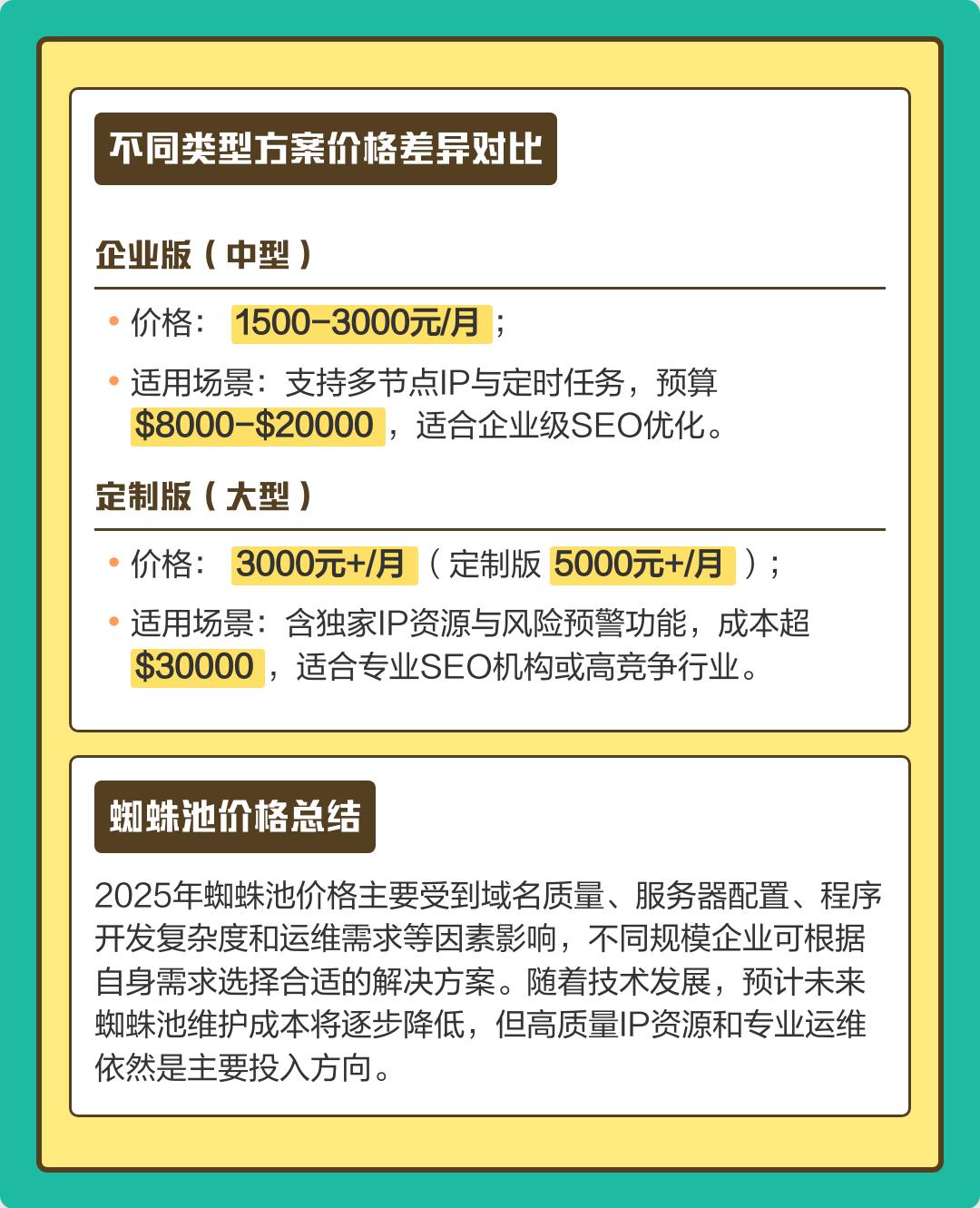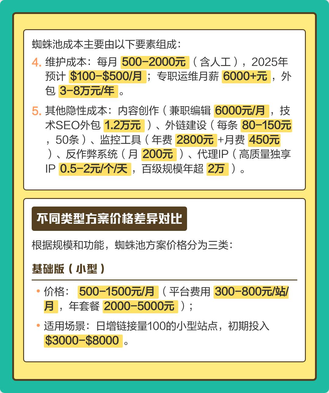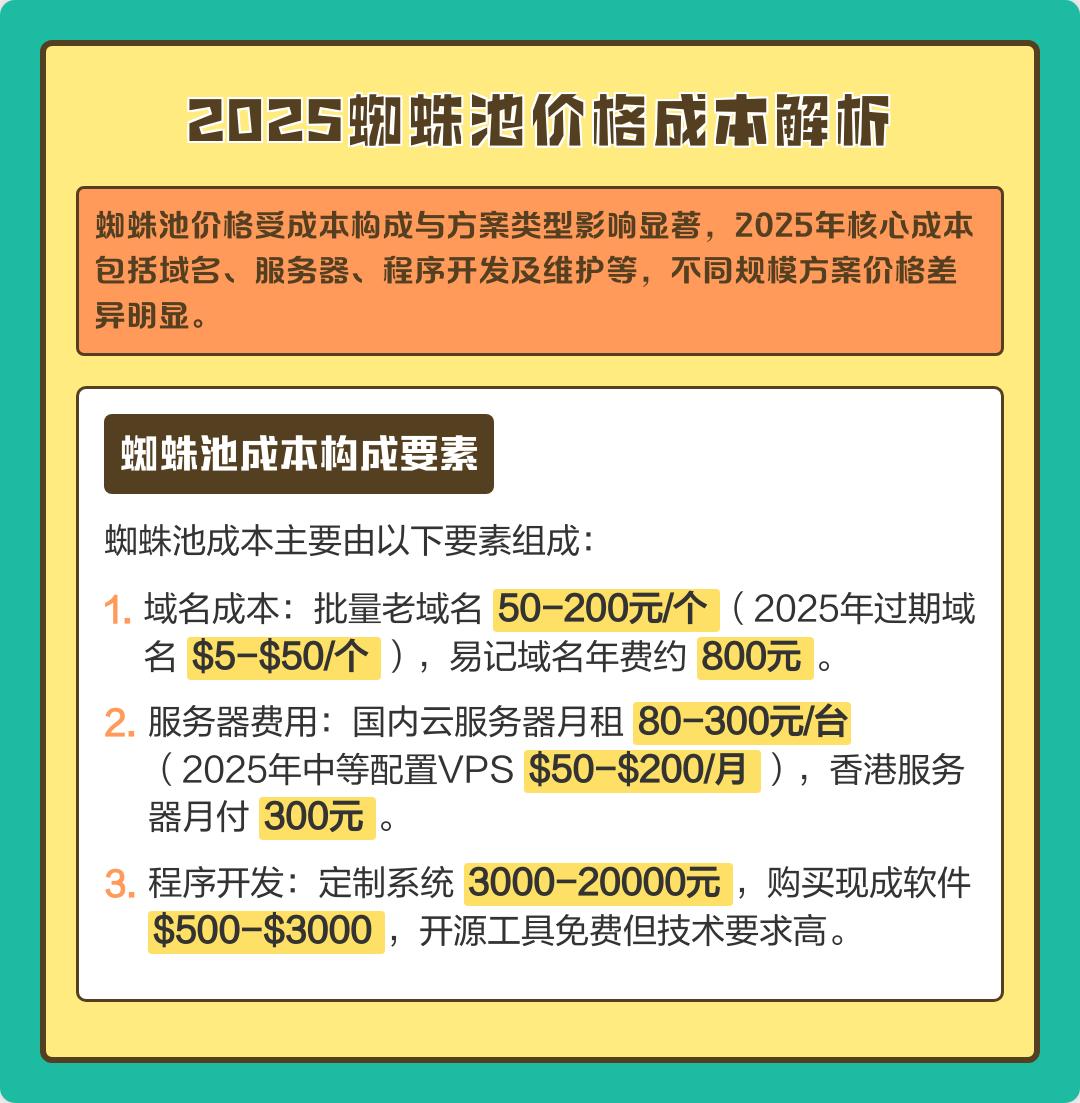 蜘蛛池价格本质是“成本与方案”的博弈,常见痛点:成本抠门致项目烂尾,或方案乱选钱烧光无效果。你做蜘蛛池最头疼的是域名成本还是方案选择?